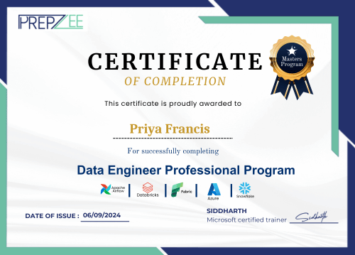 Enrolling in the Data Engineer Job Oriented Program at Prepzee,, exceeded my expectations. The course materials were insightful and provided a clear roadmap for mastering these tools. The instructors' expertise and interactive learning elements made complex concepts easy to grasp. This program has been invaluable for my professional growth, giving me the confidence to apply these technologies effectively in real-world projects.